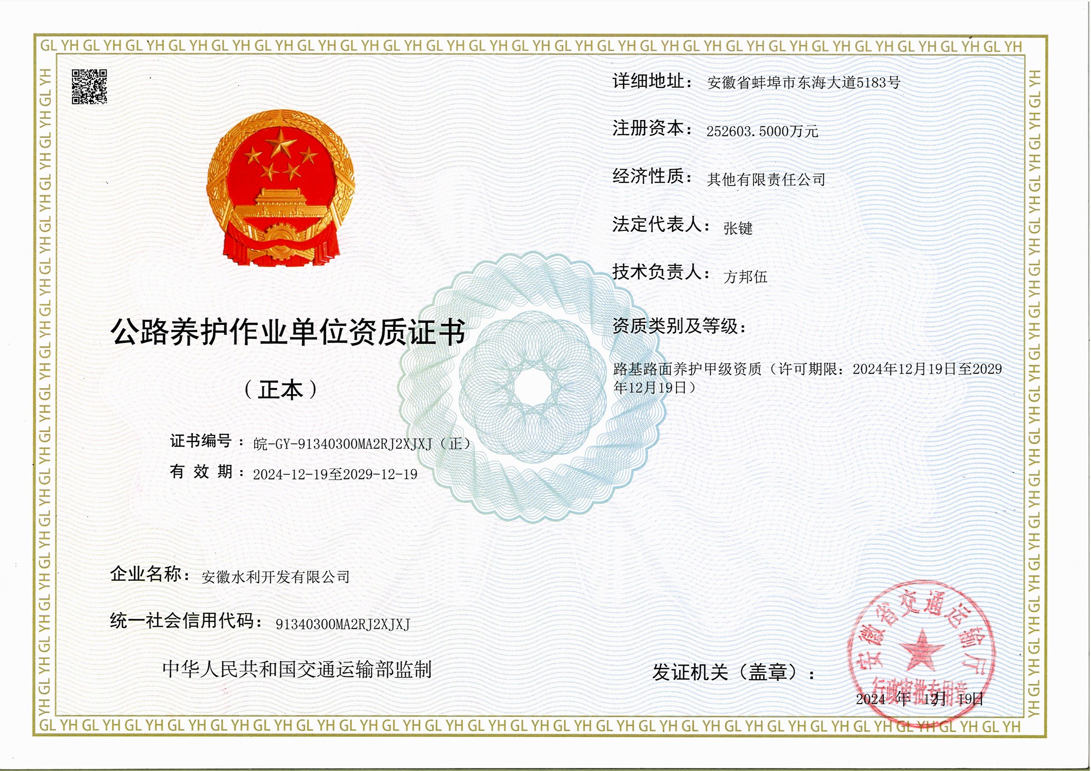 近日,安徽水利成功取得公路養(yǎng)護(hù)甲級(jí)資質(zhì)。這是繼取得公路工程施工總承包特級(jí)資質(zhì)、隧道工程專業(yè)承包貳級(jí)資質(zhì)后,安徽水利在公路施工領(lǐng)域資質(zhì)提升之路上的又一里程碑。