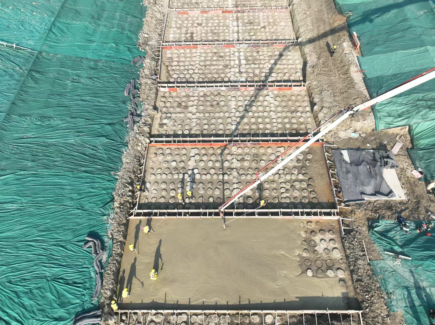 自開工以來,項目部全方位統(tǒng)籌、多措并舉,集中優(yōu)質(zhì)資源,多班分組同步作業(yè),不分晝夜搶抓工期,并在夜晚安排專人駐點現(xiàn)場值班,實時掌握施工進(jìn)度,確保各項安全、質(zhì)量管理工作穩(wěn)步進(jìn)行。在穿堤涵及防洪閘6塊底板塑性混凝土褥墊層澆筑過程中,項目團(tuán)隊強(qiáng)化質(zhì)量及安全管控工作,對冬季低溫天氣混凝土澆筑采取了防凍劑、覆蓋等相關(guān)措施,確保澆筑質(zhì)量。