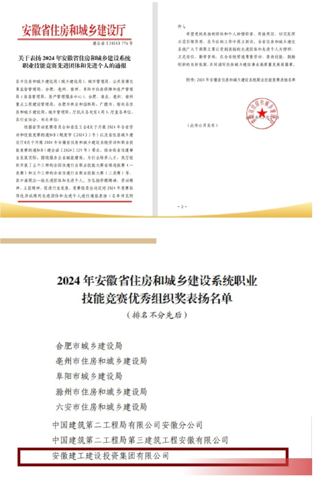 近日,安徽省住房和城鄉(xiāng)建設廳發(fā)布《關于表揚2024年安徽省住房和城鄉(xiāng)建設系統(tǒng)職業(yè)技能競賽先進團體和先進個人的通報》,對2024年競賽取得優(yōu)異成績的先進團體和先進個人進行通報表揚。其中,建工建投集團喜獲優(yōu)秀組織獎!另4名員工喜獲先進個人表揚。