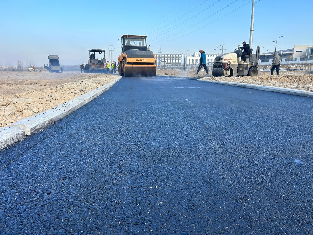 下塘臨時商業(yè)街項目的瀝青攤鋪工作正在進行?,F(xiàn)場大型運料車與瀝青攤鋪機默契配合,一前一后,正在進行緊張作業(yè)。瀝青攤鋪機駛過,厚厚的瀝青便鋪在了路面上,施工人員緊跟其后,對鋪設(shè)的瀝青進行整理、測量,同時后方還有多輛壓路機來回作業(yè),對剛剛鋪設(shè)的瀝青進行穩(wěn)固壓實,呈現(xiàn)一派熱鬧的施工景象。
