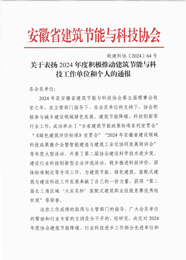 日前,安徽省建筑節(jié)能與科技協(xié)會(huì)發(fā)布通報(bào),安徽?。ㄊ徍┙ㄖ鈨σ惑w化專業(yè)委員會(huì)被評為先進(jìn)單位,公司楊海峰被評為先進(jìn)個(gè)人。