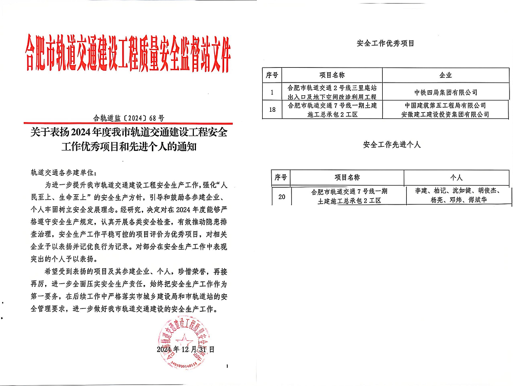 近日,建工建投集團(tuán)合肥市軌道交通建設(shè)工程質(zhì)量安全監(jiān)督站發(fā)來(lái)《關(guān)于表?yè)P(yáng)2024年度我市軌道交通建設(shè)工程安全工作優(yōu)秀項(xiàng)目和先進(jìn)個(gè)人的通知》,建工建投集團(tuán)合肥市軌道交通7號(hào)線一期土建施工總承包2工區(qū)項(xiàng)目榮獲“安全工作優(yōu)秀項(xiàng)目”稱號(hào),鄧煒、傅斌華榮獲“安全工作先進(jìn)個(gè)人”稱號(hào)。