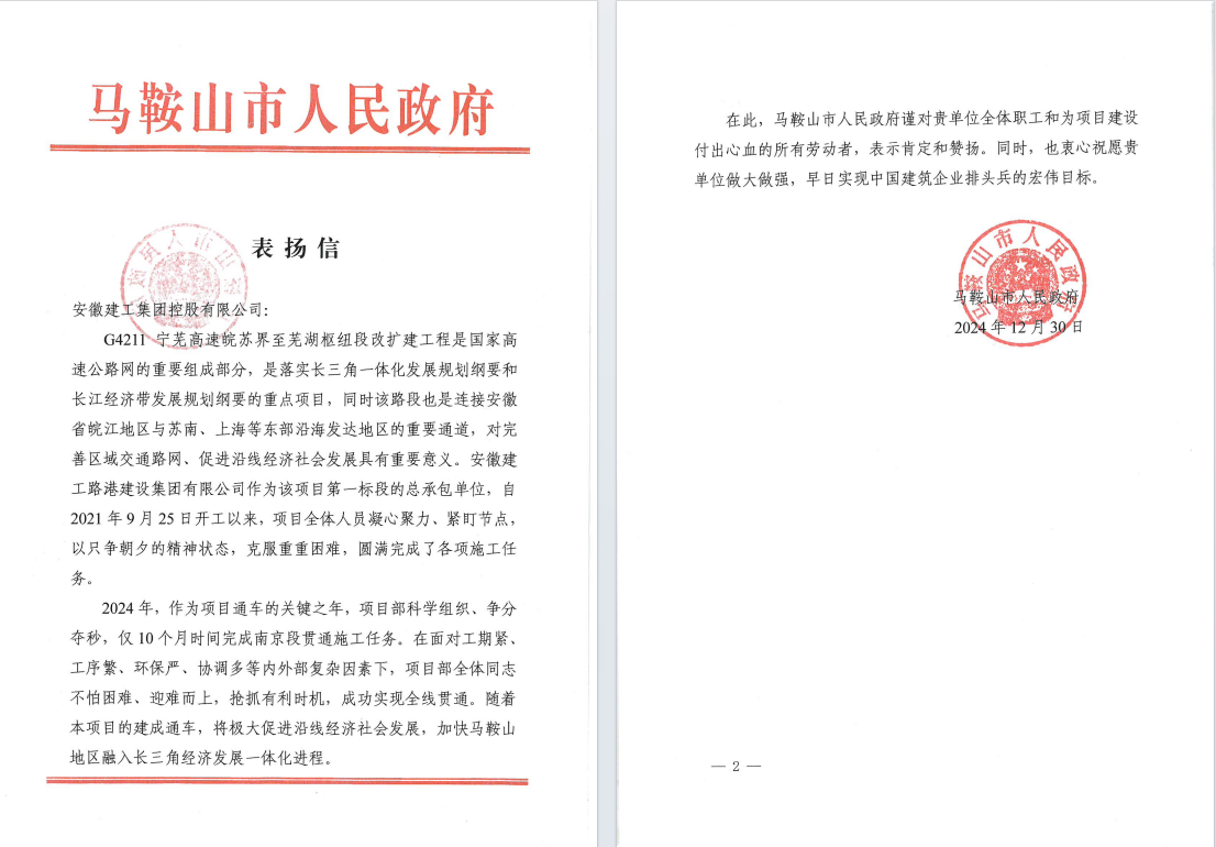 2024年12月30日,項目部收到了來自馬鞍山市人民政府的表揚信,表揚信中對安徽建工集團及安徽建工路港建設集團有限公司全體職工和為項目建設付出心血的所有勞動者表示了肯定和贊揚。這是對項目團隊辛勤付出的最大的肯定,也是對他們專業(yè)精神和敬業(yè)態(tài)度的高度認可。這份表揚信不僅是一份榮譽,更是一種激勵。這份表揚信的背后,是項目團隊無數(shù)個日夜的堅守和付出,為當?shù)亟洕鐣l(fā)展做出重要貢獻,也為集團、公司在今后的項目建設中積累了寶貴的經驗,樹立了良好的品牌形象。