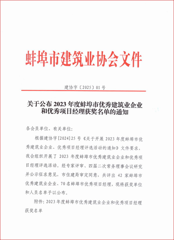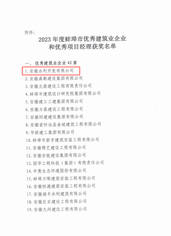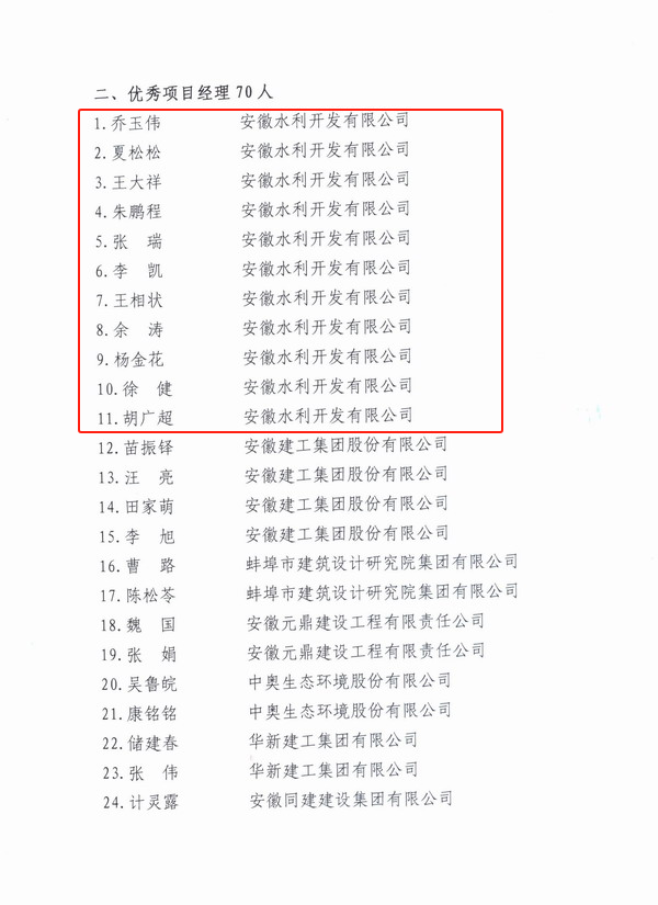 近日,蚌埠市建筑業(yè)協(xié)會專家評審委員會公布評選結(jié)果,安徽水利及所屬安徽建工生態(tài)科技股份有限公司獲評2023年度“蚌埠市優(yōu)秀建筑企業(yè)”,安徽水利員工喬玉偉、夏松松、王大祥、朱鵬程、張瑞、李凱、王相狀、余濤、楊金花、徐健、胡廣超、樂永芬、孫云利等13人榮獲“蚌埠市優(yōu)秀項目經(jīng)理”稱號。