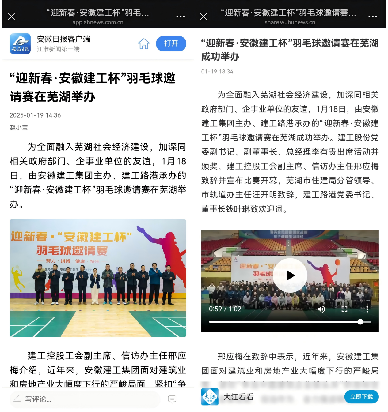 日前,安徽日?qǐng)?bào)、大江看看等省市級(jí)媒體專題報(bào)道了由建工路港承辦的“迎新春·安徽建工杯”羽毛球邀請(qǐng)賽,共同見(jiàn)證了建工路港同蕪湖屬地個(gè)相關(guān)政府部門、企事業(yè)單位的友誼之賽。