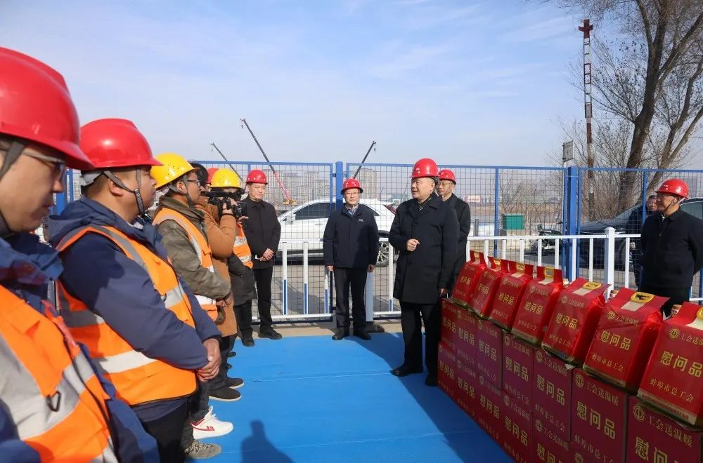 馬軍親切詢問了一線建設(shè)者們的工作生活情況,對他們不畏嚴(yán)寒、堅(jiān)守崗位、拼搏奉獻(xiàn)的精神給予高度稱贊,并向大家送上慰問品和新春祝福。