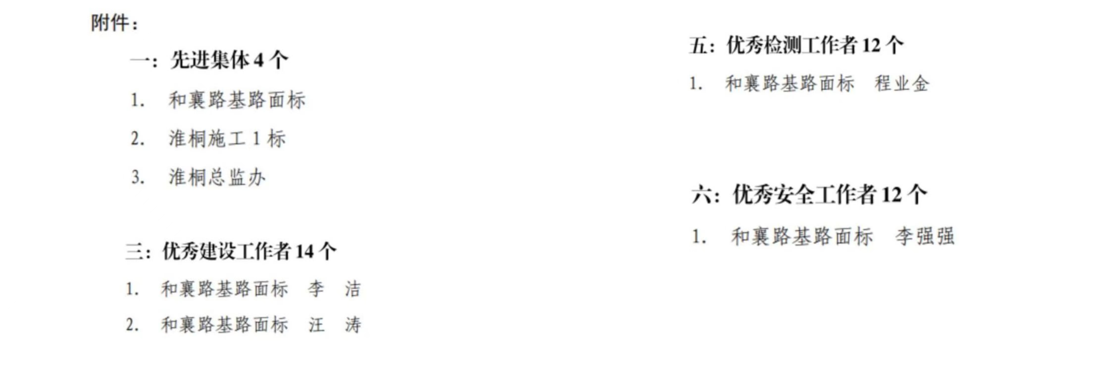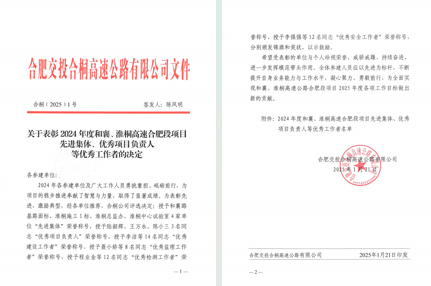 近日,由合肥交投合桐高速公路有限公司舉辦的和襄、淮桐高速合肥段2024年度工作總結大會暨表彰大會上,合桐公司對和襄高速項目的成績和表現(xiàn)給予了高度認可。建工路港和襄高速項目在四季度暨年度參建單位綜合考評中以90.37分的佳績榮獲第一名,獲得“先進集體”稱號。李潔、汪濤兩位同志被授予“優(yōu)秀建設工作者”稱號;程業(yè)金同志被授予“優(yōu)秀檢測工作者”稱號;李強強同志被授予“優(yōu)秀安全工作者”稱號。