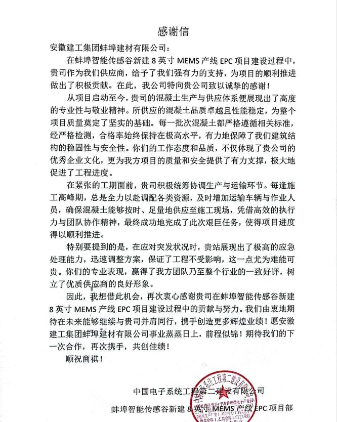 建工建材憑借其卓越的產(chǎn)品質(zhì)量、高效的供應體系以及出色的服務保障表現(xiàn)、一絲不茍、精益求精的工作精神,收到了來自中國電子、中國中鐵等央國企的感謝信。