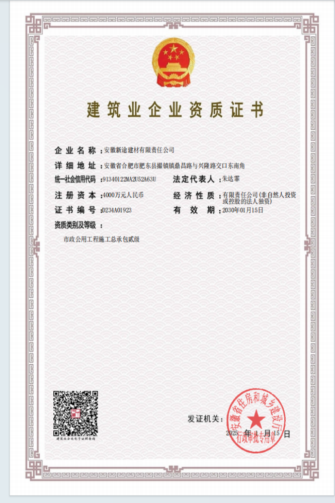 安徽新途建材有限責(zé)任公司喜獲安徽省住房和城鄉(xiāng)建設(shè)廳正式批準(zhǔn),市政公用工程施工總承包二級(jí)資質(zhì)順利通過(guò)審核,標(biāo)志著新途建材在市政公用工程領(lǐng)域邁上了新的臺(tái)階,市場(chǎng)競(jìng)爭(zhēng)力得到顯著提升,為公司的業(yè)務(wù)范圍拓展奠定了堅(jiān)實(shí)的基礎(chǔ)。