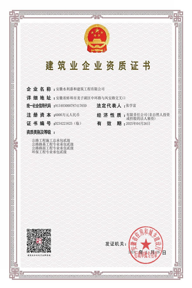 經(jīng)建筑主管部門核準(zhǔn),嘉和建筑成功獲批公路工程施工總承包貳級(jí)、公路路基工程專業(yè)承包貳級(jí)、公路路面工程專業(yè)承包貳級(jí)、環(huán)保工程專業(yè)承包貳級(jí)資質(zhì)。