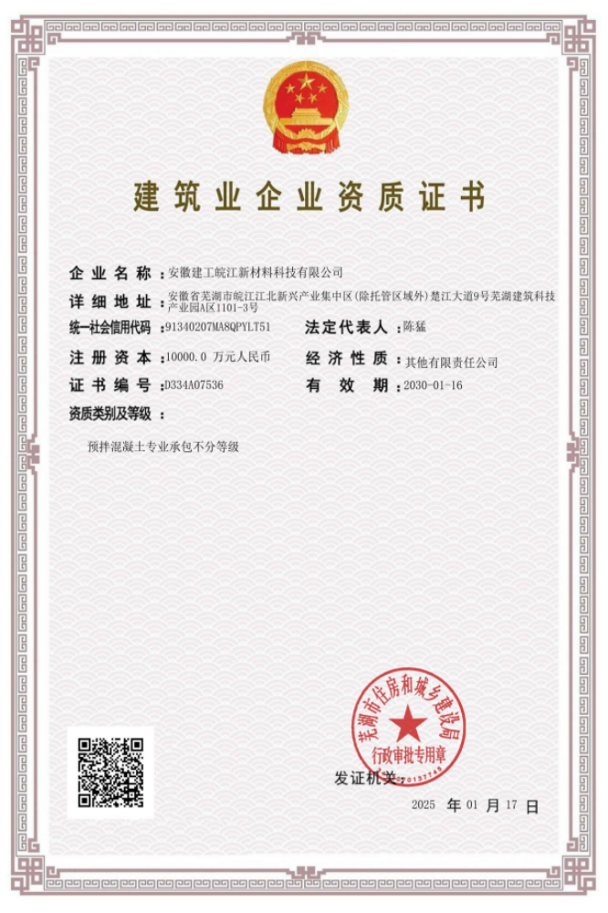 安徽建工皖江新材料科技有限公司經(jīng)蕪湖市住房和城鄉(xiāng)建設(shè)局正式批準(zhǔn),獲得預(yù)拌混凝土專業(yè)承包資質(zhì),此次資質(zhì)的取得,不僅代表皖江新材料從建設(shè)期到運(yùn)營(yíng)期的轉(zhuǎn)型邁出了重要一步,更為公司在蕪湖預(yù)拌混凝土市場(chǎng)的深入開(kāi)拓提供了新機(jī)遇。