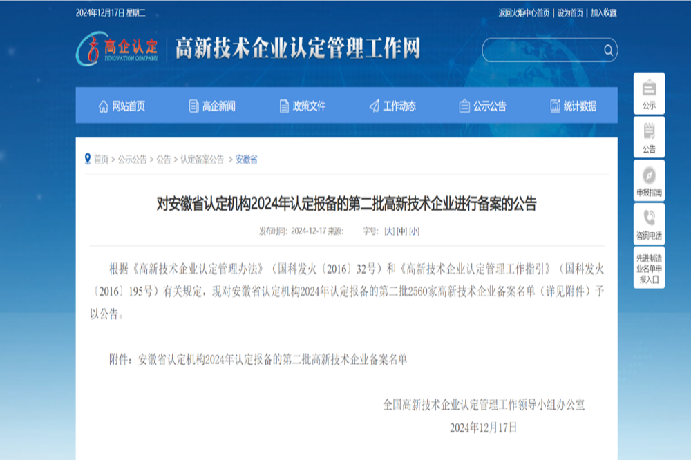 國(guó)家高新技術(shù)企業(yè)認(rèn)定管理工作網(wǎng)發(fā)布《對(duì)安徽省認(rèn)定機(jī)構(gòu)2024年認(rèn)定報(bào)備的第二批高新技術(shù)企業(yè)進(jìn)行備案的公告》,建工建材安徽瑞特公司名列其中,成功獲評(píng)國(guó)家“高新技術(shù)企業(yè)”。