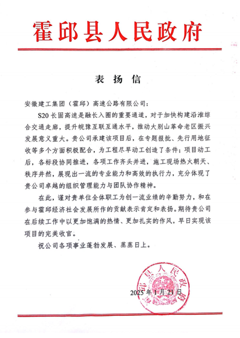 1月24日,建工投資S20長固高速霍邱至皖豫界段項目喜獲霍邱縣人民政府通報表揚(yáng),充分肯定了項目公司在前期工作推進(jìn)方面取得的豐碩成果。