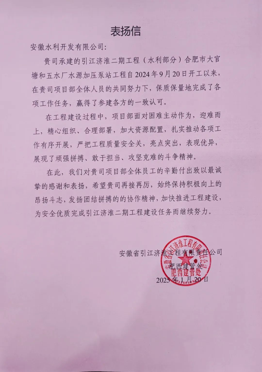 引江濟淮加壓泵站項目收到業(yè)主表揚信,信中指出,自2024年9月20日開工以來,項目部全體人員面對困難主動作為,迎難而上,精心組織、合理部署,加大資源配置,扎實推動各項工作有序開展,嚴(yán)把工程質(zhì)量安全關(guān),亮點突出,表現(xiàn)優(yōu)異,展現(xiàn)了頑強拼搏、敢于擔(dān)當(dāng)、攻堅克難的斗爭精神,贏得了參建各方的一致認(rèn)可。同時,項目兩位員工榮獲業(yè)主單位2024年勞動競賽“先進個人”稱號。