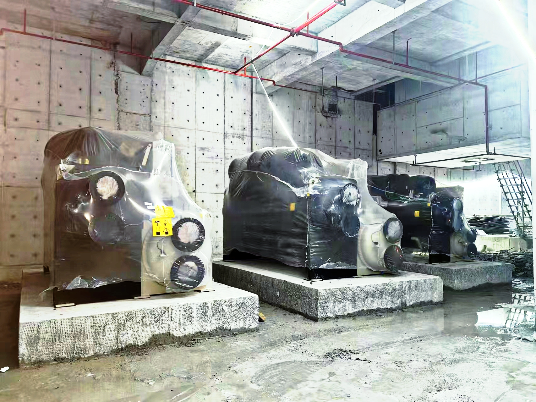 清晨7時(shí)許,施工現(xiàn)場(chǎng)已是一片繁忙而有序的景象。醒目的安全警戒線早已拉設(shè)完畢,擴(kuò)音器中不斷傳來清晰而有力的安全提示語,為整個(gè)施工現(xiàn)場(chǎng)營(yíng)造出濃厚的安全生產(chǎn)氛圍。隨著1臺(tái)130噸級(jí)重型吊車和數(shù)臺(tái)重型叉車的準(zhǔn)時(shí)進(jìn)場(chǎng),吊裝作業(yè)正式拉開了帷幕。在管理人員的精準(zhǔn)引導(dǎo)下,吊車巨大的起重臂緩緩升起,宛如一條鋼鐵巨龍般騰空而上,將一套套冷卻設(shè)備從吊裝口穩(wěn)穩(wěn)“銜”起,再精準(zhǔn)無誤地落到指定位置。機(jī)房?jī)?nèi),兩臺(tái)叉車在工作人員的協(xié)同配合下靈活穿梭,將設(shè)備準(zhǔn)確安置到預(yù)定的安裝位置。整個(gè)吊裝過程井然有序,緊張而不失從容。夜幕降臨,寒風(fēng)刺骨,但現(xiàn)場(chǎng)依然是一片熱火朝天的大干景象,大伙兒似乎都已經(jīng)忘卻了疲憊和寒冷。終于,經(jīng)過全體人員近12個(gè)小時(shí)的不懈奮戰(zhàn)和連續(xù)作業(yè),所有重型設(shè)備均成功吊裝到位。隨著吊車和叉車有序撤離施工現(xiàn)場(chǎng),本次吊裝作業(yè)圓滿完成。