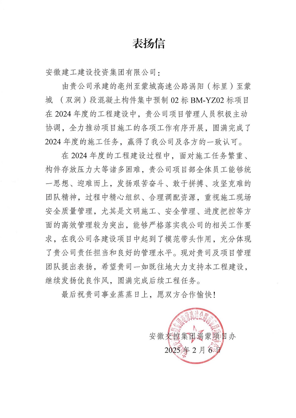 表揚(yáng)信指出,亳蒙預(yù)制02標(biāo)項(xiàng)目在2024年度的工程建設(shè)過程中,面對施工任務(wù)繁重、構(gòu)件存放壓力大等諸多困難,項(xiàng)目部全體員工能夠統(tǒng)一思想、迎難而上,發(fā)揚(yáng)艱苦奮斗、敢于拼搏、攻堅(jiān)克難的團(tuán)隊(duì)精神,過程中精心組織、合理調(diào)配資源,重視施工現(xiàn)場安全質(zhì)量管理,尤其是文明施工、安全管理、進(jìn)度把控等方面的高效管理較為突出,能夠嚴(yán)格落實(shí)業(yè)主單位的相關(guān)工作要求,在各建設(shè)項(xiàng)目中起到了模范帶頭作用,項(xiàng)目管理人員積極主動協(xié)調(diào),全力推動項(xiàng)目施工的各項(xiàng)工作有序開展,圓滿完成了2024年度的施工任務(wù),贏得了業(yè)主單位及各方的一致認(rèn)可。