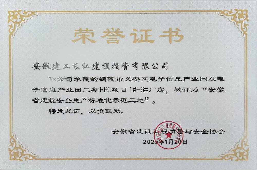 近日,安徽省建設(shè)工程質(zhì)量與安全協(xié)會(huì)公布了2024年度第四批安徽省建筑安全生產(chǎn)標(biāo)準(zhǔn)化工地名單,由長(zhǎng)江建投承建的銅陵市義安區(qū)電子信息產(chǎn)業(yè)園及電子信息產(chǎn)業(yè)園二期 EPC 項(xiàng)目1#-6#廠房獲評(píng)“安徽省建筑安全生產(chǎn)標(biāo)準(zhǔn)化工地”稱號(hào)。
