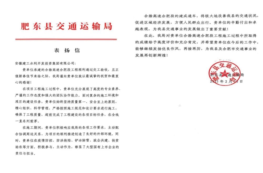 信中指出,合滁高速項(xiàng)目展現(xiàn)出了強(qiáng)大的專業(yè)實(shí)力和高效的執(zhí)行能力,在工程質(zhì)量、進(jìn)度、安全以及文明施工等方面均表現(xiàn)出色,為肥東縣的交通基礎(chǔ)設(shè)施建設(shè)做出了重要貢獻(xiàn),樹立了行業(yè)標(biāo)桿。