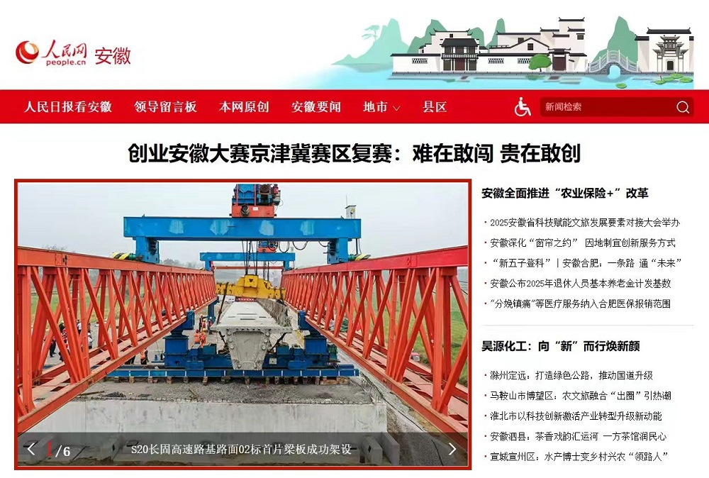 2025年10月15日,建工建投集團(tuán)S20長固高速路基路面02標(biāo)首片梁板成功架設(shè)。人民網(wǎng)記者深入項(xiàng)目一線展開報(bào)道,稿件登上人民網(wǎng)安徽頻道首頁。
