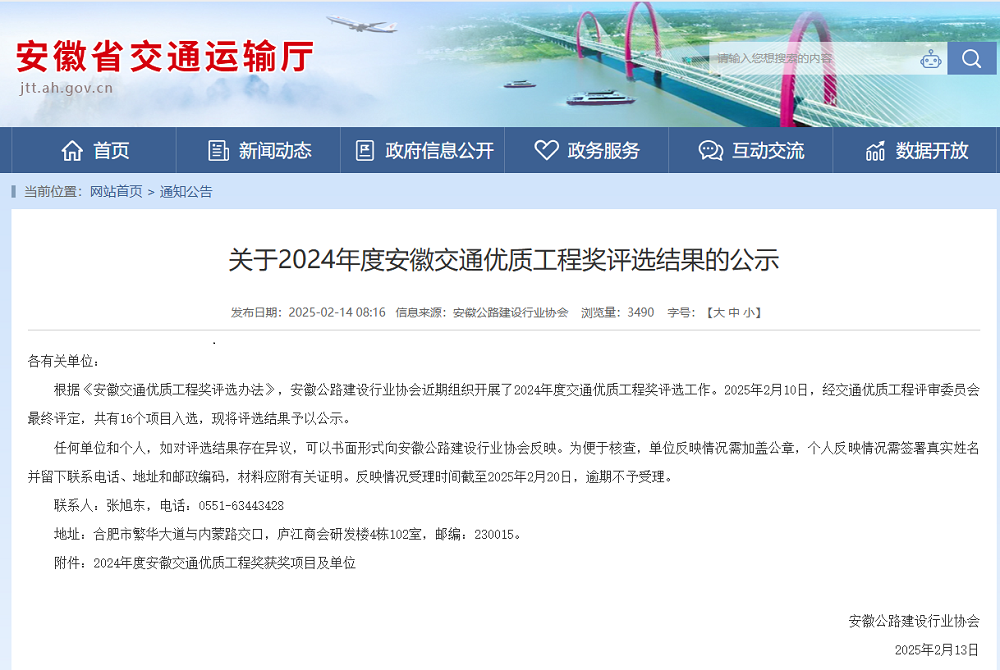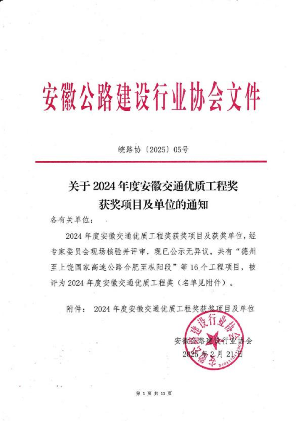 近日,安徽公路建設(shè)行業(yè)協(xié)會發(fā)布通知文件,公布2024年度安徽交通優(yōu)質(zhì)工程獎評選結(jié)果及單位名單,共16個工程項目獲獎。