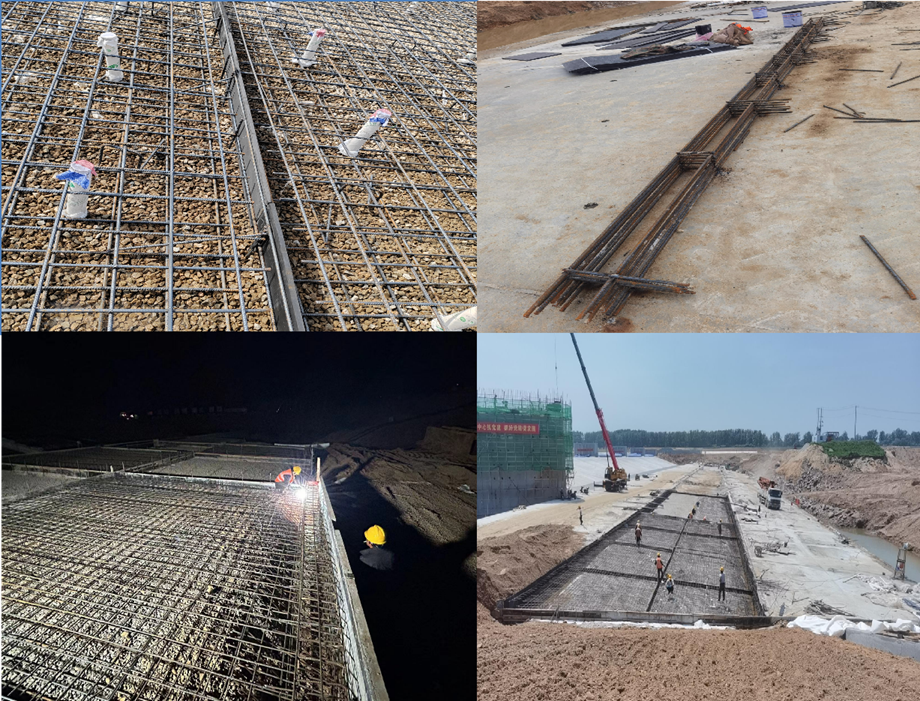 因葉集史河地質(zhì)為沙地,傳統(tǒng)的降水無法降水,項(xiàng)目創(chuàng)新性地采用消力池降水方案,不僅顯著擴(kuò)大了降水面積,還成功開啟閘室底板工作面,在降低成本支出的同時大幅縮短了施工周期。在海漫施工中,項(xiàng)目研制新型模板一體化體系,代替原本的7.5m分縫跳倉澆筑方案和傳統(tǒng)模板安裝,做到連續(xù)澆筑,由原來的每天澆筑6-8塊提高至每天可澆筑16-32塊。防沖墻的導(dǎo)墻由鋼筋砼優(yōu)化為裝配式“L”型間距可調(diào)節(jié)鋼導(dǎo)墻,相比鋼筋砼導(dǎo)墻,鋼結(jié)構(gòu)導(dǎo)墻具有安拆方面、節(jié)約成本、不易磕碰、工期短等優(yōu)點(diǎn),去除了立模、混凝土澆筑等工序??障錆仓謨蓪邮┕?,第一層完成后空箱采用機(jī)械回填后在澆筑隔板代替預(yù)留孔洞人工配合回填,速度更快更安全;格賓石籠網(wǎng)箱高度由0.5m改為1m,無需分2層施工(設(shè)計(jì)格賓石籠1m),節(jié)約工期施工成本10萬元,縮短工期20天左右。通過優(yōu)化一系列施工方案、工序及新技術(shù),總計(jì)節(jié)約費(fèi)用約134萬,節(jié)約工期122天。