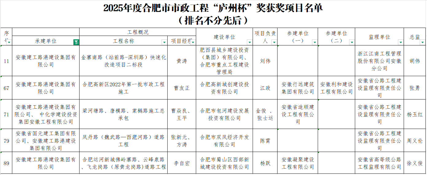 近日,合肥市市政工程協(xié)會正式公布《關(guān)于2025年度合肥市市政工程“廬州杯”獎獲獎項目名單的通知》,建工路港五個項目榮獲該獎項。
