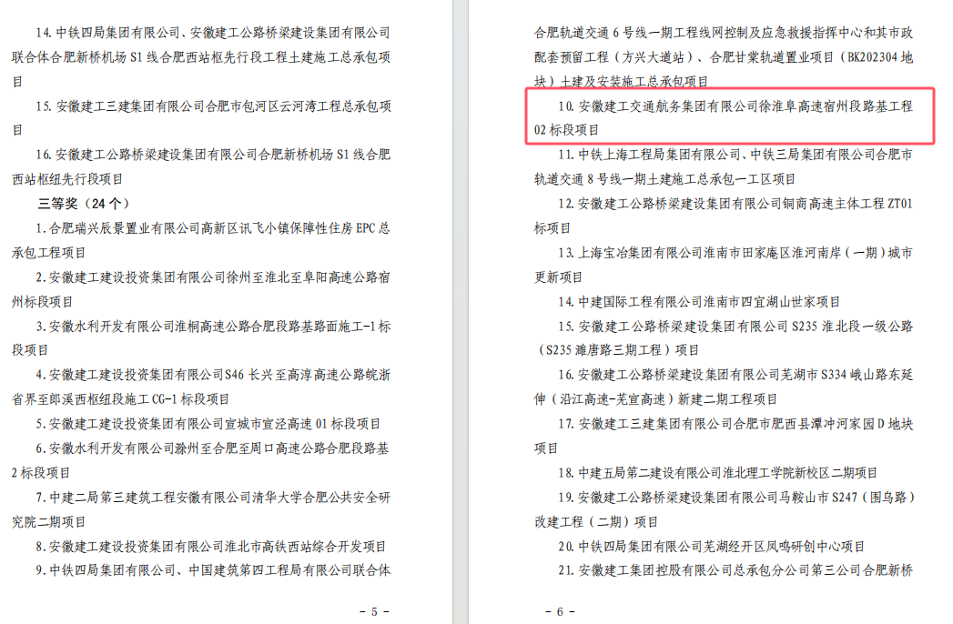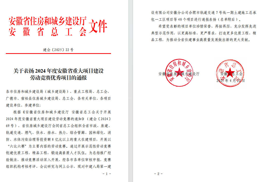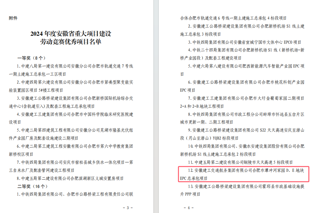 近日,安徽省住房和城鄉(xiāng)建設(shè)廳、安徽省總工會聯(lián)合發(fā)布《關(guān)于表揚 2024 年度安徽省重大項目建設(shè)勞動競賽優(yōu)秀項目的通報》,公司潭沖河家園 D、E 地塊 EPC 總承包項目和徐淮阜高速宿州段路基工程 02 標項目表現(xiàn)突出,成功入選優(yōu)秀項目名單。