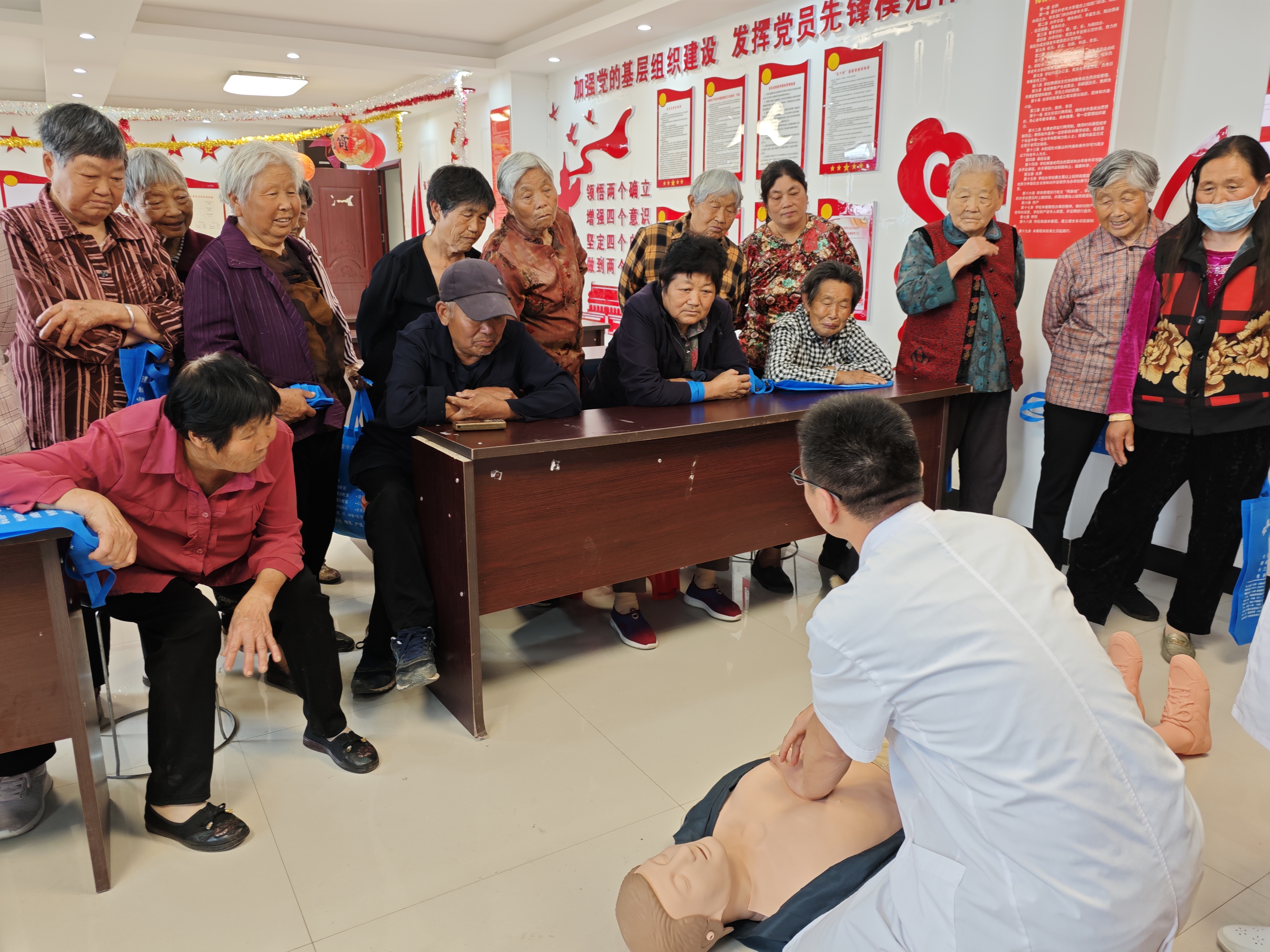 活動現(xiàn)場,醫(yī)師們耐心細致地為村民進行檢查,詢問病史、解答疑問,根據(jù)個體情況給出專業(yè)治療預防方案,發(fā)放健康宣傳資料和家庭急救包。在健康宣教中,為村民詳細介紹心肺復蘇的基礎知識和操作技巧,通過人體模型演示胸外按壓和人工呼吸的正確方法,使村民對心肺復蘇等急救技能有了更直觀清晰的了解。