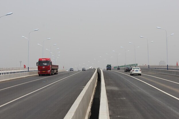 205國道馬鞍山段全長19.075公里,雙向6車道,設(shè)計時速80公里,設(shè)置輔道、人行道。本工程有采石河橋、襄城河橋、姑溪河大橋、大唐電力上跨橋四座橋梁,其中姑溪河大橋于4月13日合龍。
