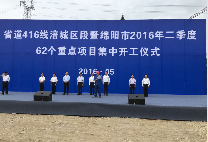 5月17日上午,省道416線涪城區(qū)段暨綿陽市2016年二季度62個重點項目集中開工儀式在安徽路港承建標(biāo)段隆重舉行,綿陽市市委書記彭宇行、市長劉超、市人大、市政協(xié)等領(lǐng)導(dǎo)出席開工儀式。