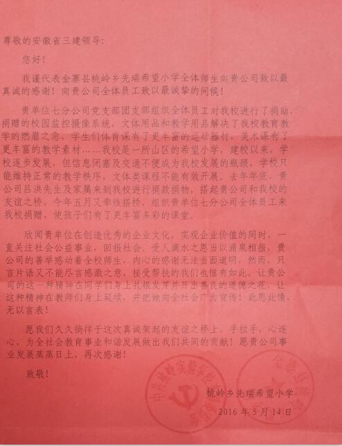 6月13日,安徽三建公司收到金寨縣桃?guī)X鄉(xiāng)先瑞希望小學(xué)發(fā)來感謝信,感謝安徽三建七分公司對(duì)先瑞希望小學(xué)的愛心捐助、無私貢獻(xiàn)、大愛無疆。