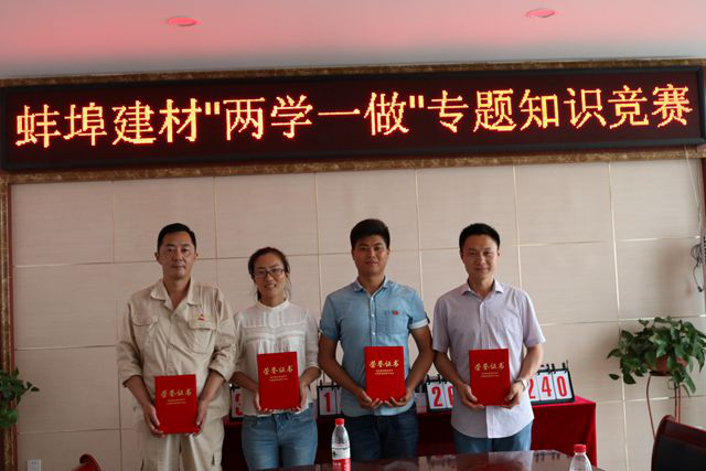 2016年6月20日下午,安徽建工集團(tuán)蚌埠建材有限公司舉辦“兩學(xué)一做”專(zhuān)題知識(shí)競(jìng)賽活動(dòng)。本次競(jìng)賽分“個(gè)人風(fēng)采”、“快速搶答”、“放手一搏”三個(gè)環(huán)節(jié),生產(chǎn)、營(yíng)銷(xiāo)、核算、質(zhì)量等部門(mén)16名代表組成四支代表隊(duì)積極參賽。