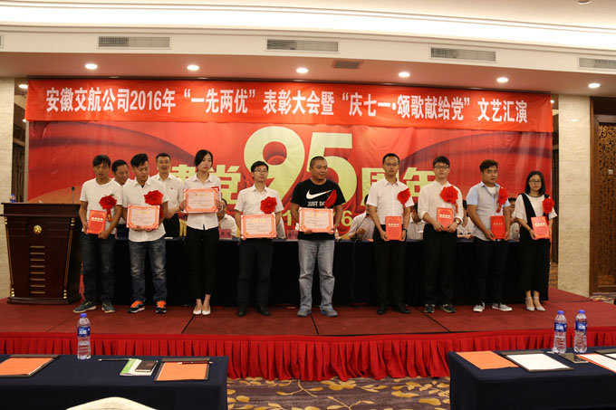 為隆重紀念中國共產黨成立95周年,6月22日下午,安徽交航公司順利召開了2016年“一先兩優(yōu)”表彰大會暨“迎七一•頌歌獻給黨”文藝匯演。交航公司領導班子成員、機關全體黨員、各黨(總)支部負責人、獲獎黨員、入黨積極分子共計100余人參加了會議,會議由交航公司紀委書記、工會主席李楊主持。
