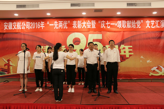 表彰大會后,安徽交航公司舉辦了“迎七一•頌歌獻給黨”文藝匯演?!洞虬袣w來》、《大中國》、《我的中國心》、《映山紅》、《南泥灣》等一首首膾炙人口、耳熟能詳的經典革命歌曲高亢有力,詩歌朗誦《黨在我心中》抑揚頓挫、感情真摯,舞蹈《洗衣歌》、《建工騰飛更輝煌》歡快活潑、積極自信,充分表達了廣大職工對黨和國家的熱愛之情,也展示了交航公司職工積極向上、團結進取的精神風貌,文藝匯演在交航公司機關合唱隊演唱的《四渡赤水出奇兵》聲中圓滿落下帷幕。