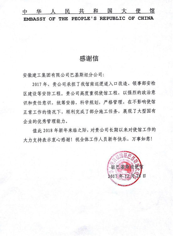 On the occasion of the coming New Year''s Day, 2018, Embassy of the People’s Republic of China in Pakistan sent a letter of thanks to ACEG Pakistan Branch highly commending the state-of-the-art technologies, the qualities and the managements for the modification and construction works of the Embassy’s facilities and premises completed by ACEG Pakistan Branch and also expressing its new year’s blessings to all staff of ACEG Pakistan Branch.